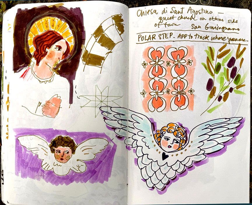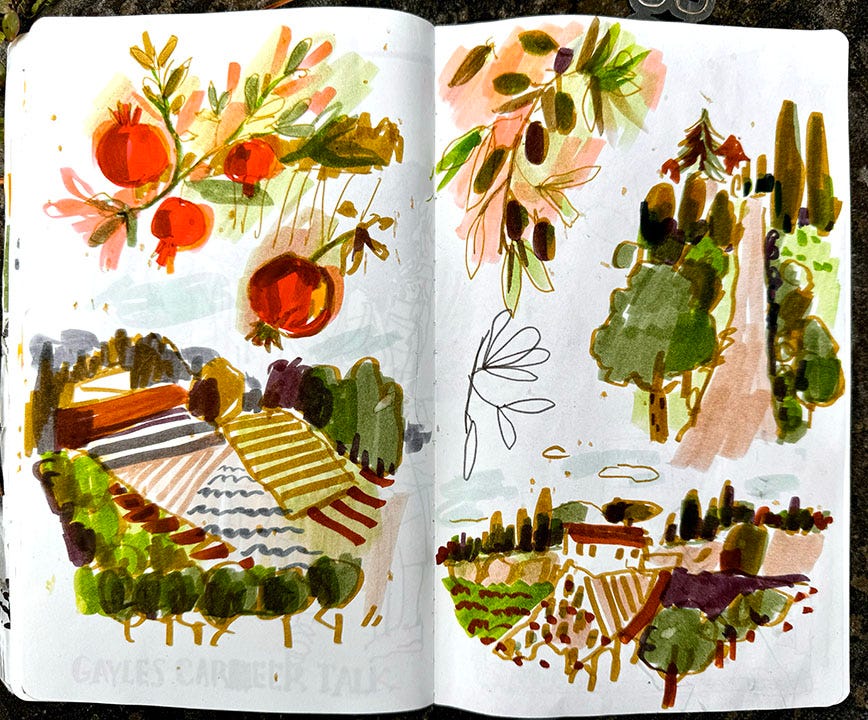 I sometimes use the sketchbook to plan ideas for a painted page, but I also just draw little things that interest me. Those little bits may end up in a painting, but more importantly, I’ve created images of things in my own style that I want to remember. All the thousands of photos don’t jog the memory in the same way.